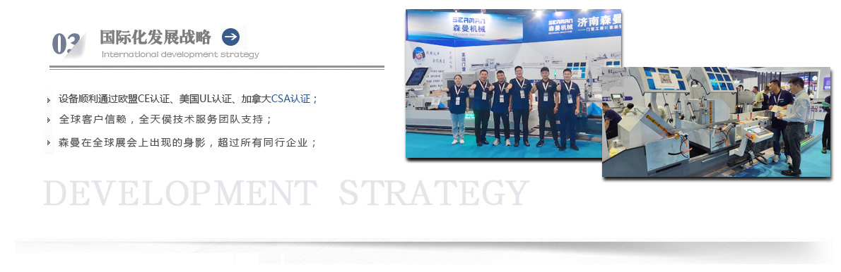 “森曼機械”作為全球門窗設備供應商,本著"seaman"精神,勇立潮頭,拼搏創(chuàng)新,以爭做行業(yè)為目標,在行業(yè)前輩發(fā)展的基礎上,努力學習,積極進取。目前公司產品涵蓋塑料門窗設備、鋁合金門窗設備、鋁幕墻設備、鋁木復合門窗設備及中空玻璃設備五大種類,近百個品種。公司產品銷售至全國各地及東南亞、非洲、東歐、北美等幾十個國家和地區。在這個競爭激烈的年代,我們正努力使我們的產品!